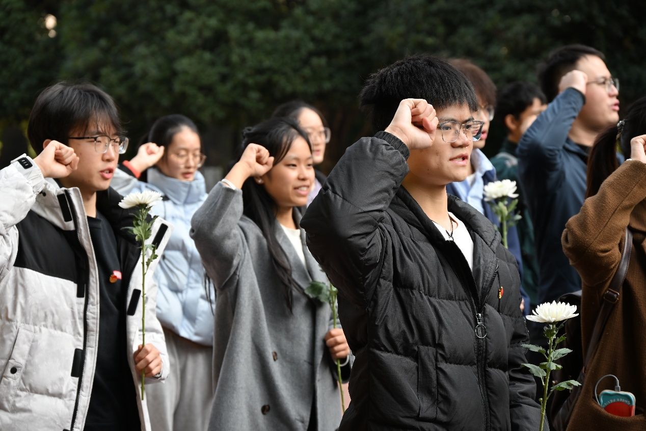 最后,支部成员向在“11·27”大屠杀中英勇就义的烈士们行三鞠躬礼,并一一敬献白菊。这不仅表达了对革命先辈的无限哀思与崇高敬意,也展现出新时代重大青年铭记历史、开创未来的坚定决心。