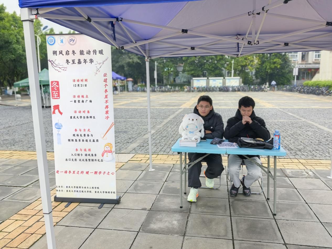 岁至冬至,春归有期,冬至素有“冬至大如年”的深厚文化积淀。12月21日,由能源与动力工程学院主办,航空航天学院、物理学院协办的“朔风启冬,能动传暖”冬至嘉年华活动,在重庆大学科学城校区虎溪校园一食堂南广场开展。此次活动旨在弘扬中华优秀传统文化,丰富校园文化生活,为凛冽冬日里的校园注入融融暖意。