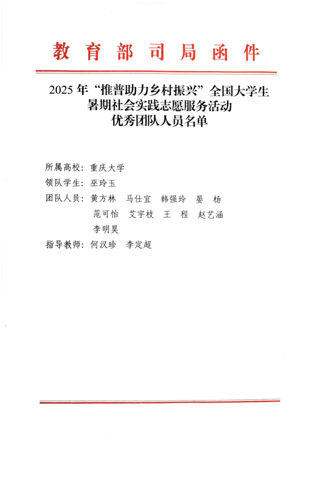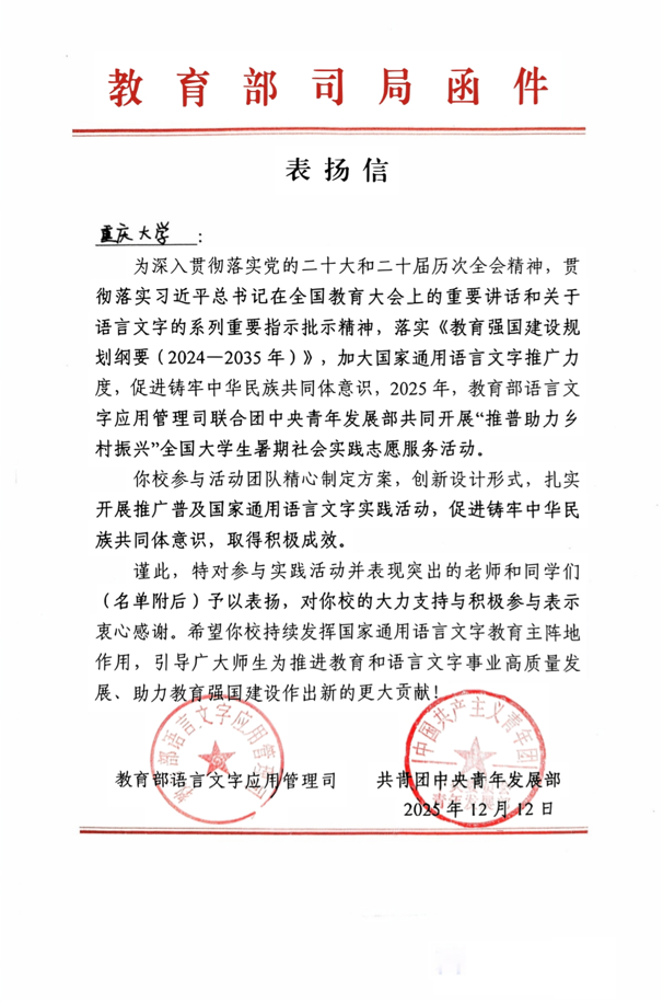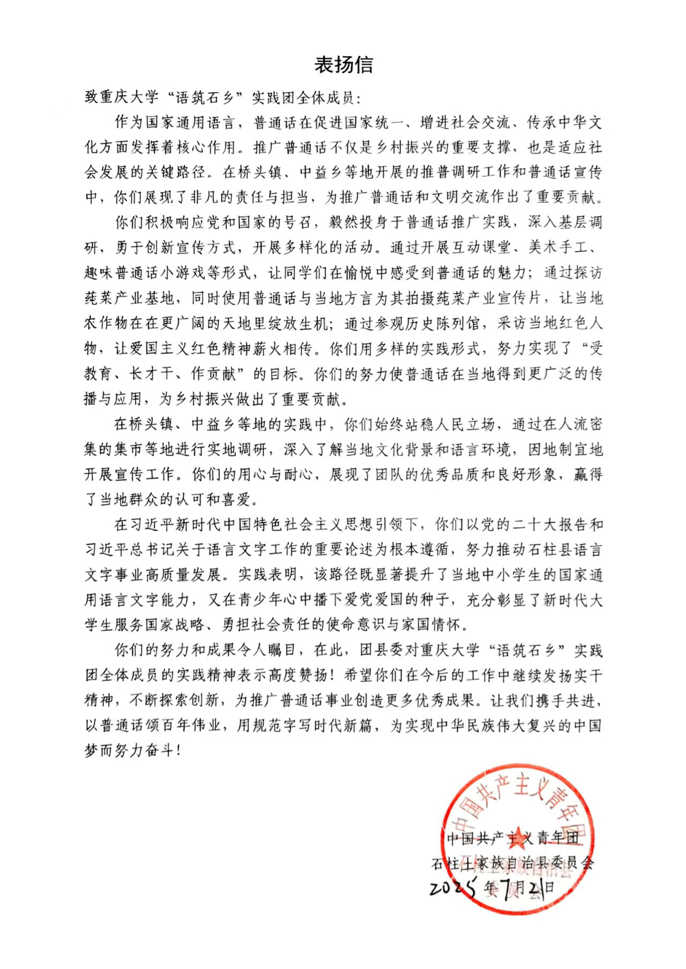 近日,由教育部语言文字应用管理司联合共青团中央青年发展部共同开展的2025年“推普助力乡村振兴”全国大学生暑期社会实践志愿服务活动进入总结表彰环节,重庆大学“语筑石乡”实践团(重庆大学赴石柱土家族自治县桥头镇推普助力乡村振兴服务队)获评全国优秀团队。同时,我校收到来自教育部语言文字应用管理司和共青团中央青年发展部来信表扬。