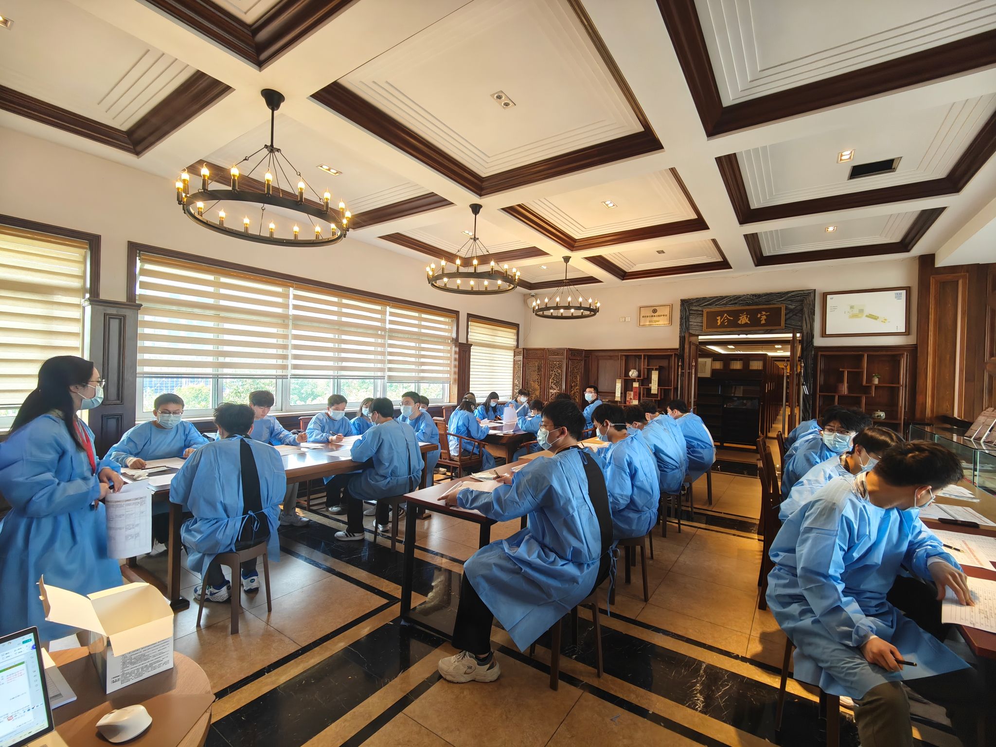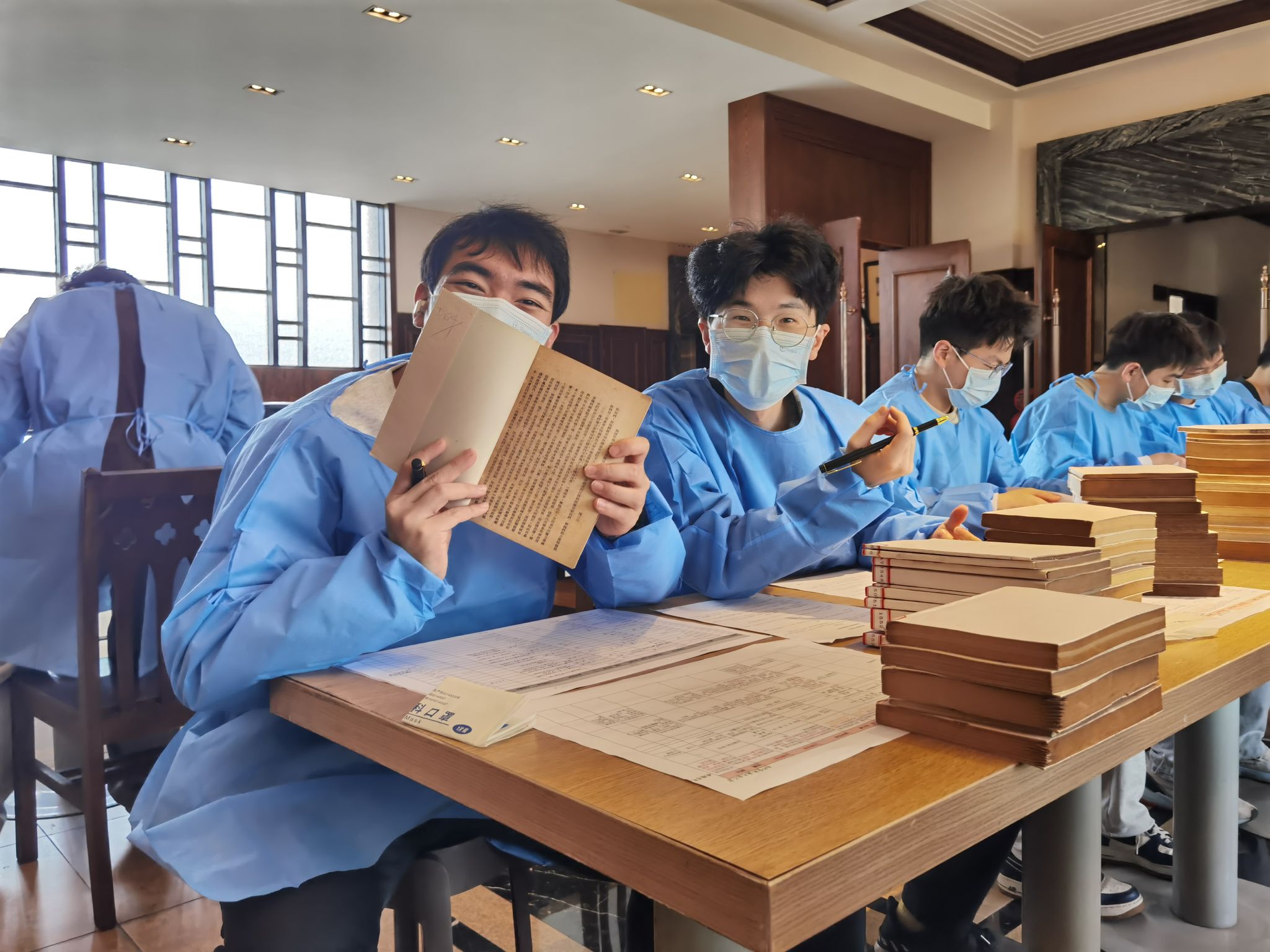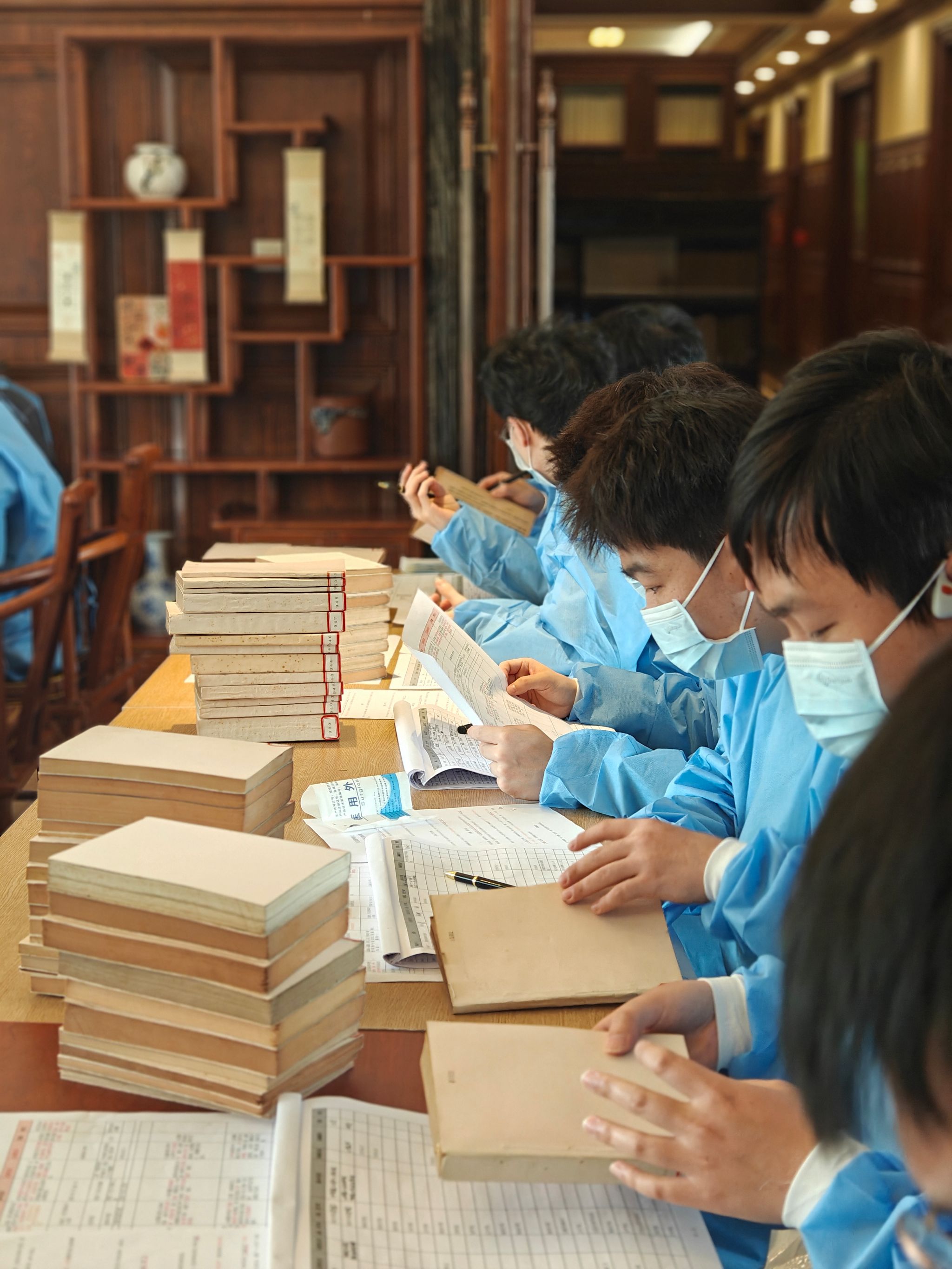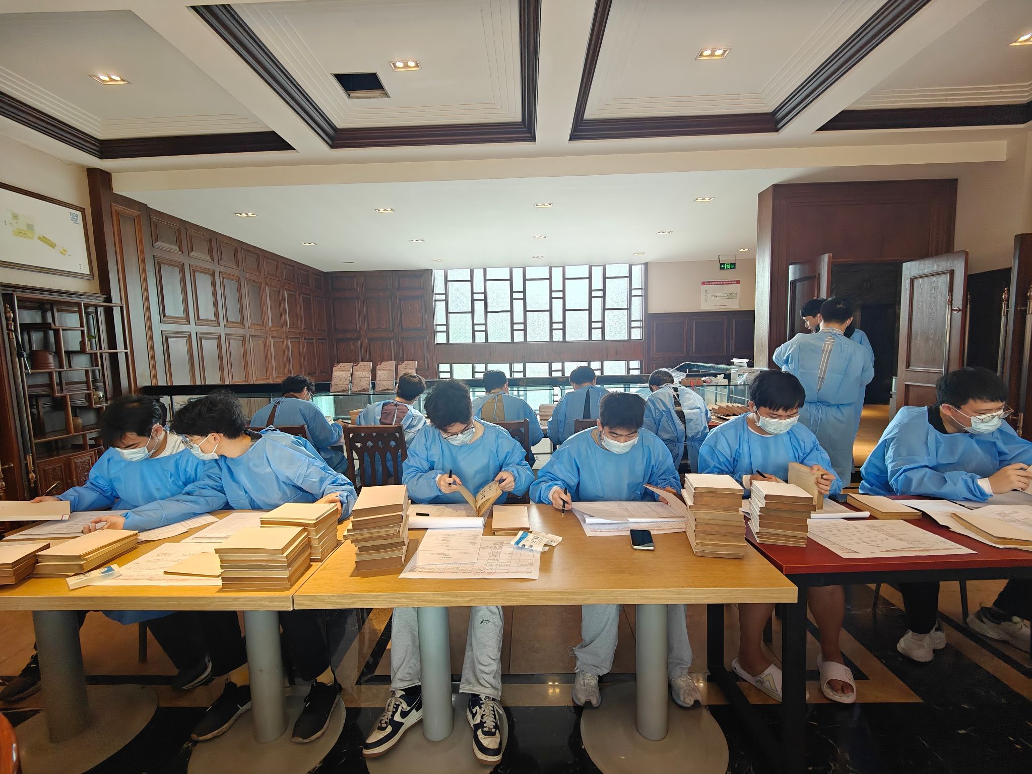 在实践环节,党员们身着防护装备,分工协作、严谨细致地开展工作,逐页核对书名页信息,补充书名、作者及出版信息,规范录入与编号管理。面对字迹模糊、纸张老化等问题,大家反复比对、精细校核,以高度责任感确保数据准确完整。通过沉浸式参与文献整理,党员们深刻体会到文化遗产保护工作的专业性与严肃性,也在细致实践中深化了对总书记“功成不必在我、功成必定有我”精神的理解。
